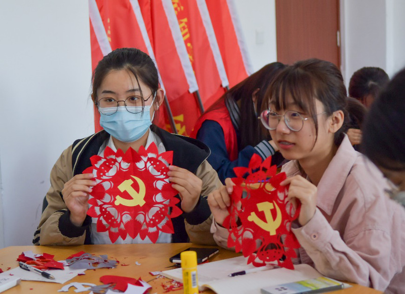 在乐道书院,潍坊市民俗博物馆的老师们通过现场讲解,让同学们从民俗、文化与饮食三方面了解多彩的潍坊。在非遗手工体验课上,同学们以剪纸为载体,以建党一百周年为主题,折、剪、展、粘,亲身感受剪纸的魅力。