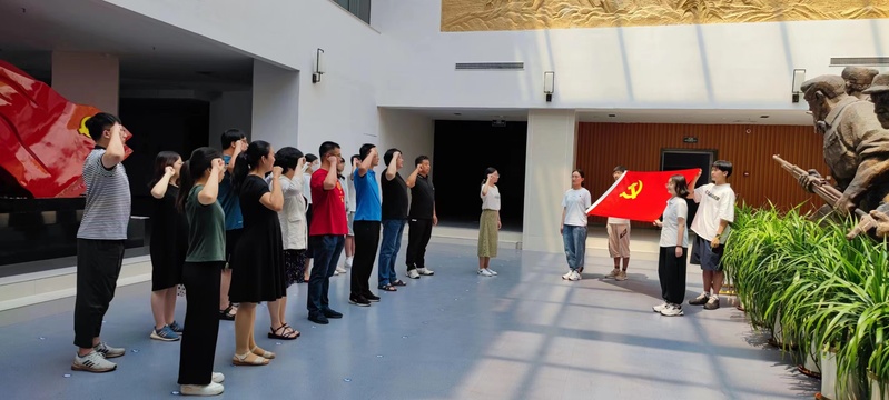 在陈列馆,党员们跟随讲解员的步伐,聆听着牛头镇抗日武装起义与八支队征战沙场的光辉历程,在一段段讲述、一幅幅图片、一件件物品、一座座雕塑中重温那段艰苦卓绝的斗争岁月,缅怀老一辈无产阶级革命家的丰功伟绩。参观结束后,在鲜红的党旗下,全体党员排成整齐队列,进行新党员入党宣誓、老党员重温入党誓词,拳拳初心、铮铮誓言,铿锵有力的宣誓声激荡回响,表达了同志们对党的无限忠诚和崇高敬仰。