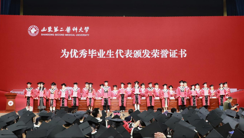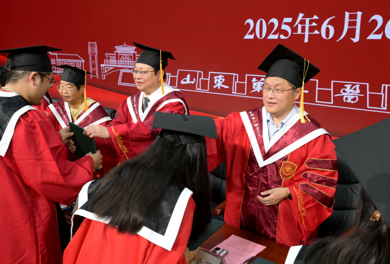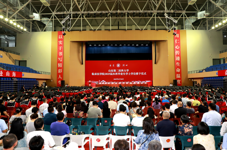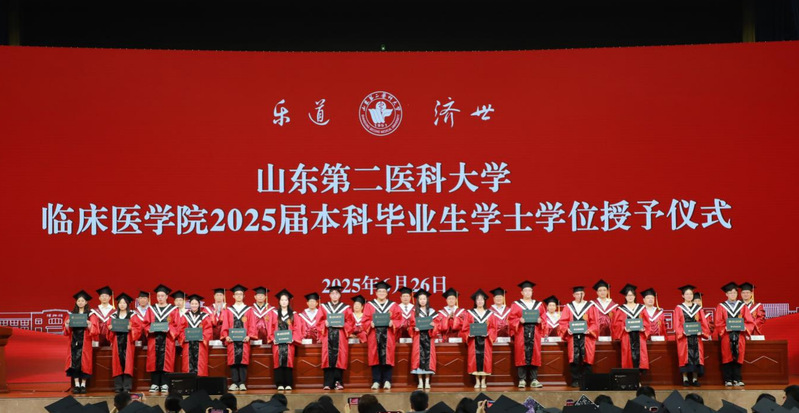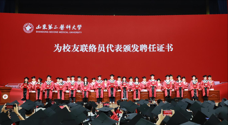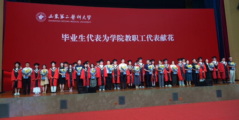 学院(医院)党委副书记、院长邓爱军宣读2025届毕业生校友联络员聘任名单。副院长高伟宣读2025届优秀毕业生表彰决定。副院长路中宣读授予学士学位的决定。教师代表刘勇、毕业生家长代表王凤平、毕业生代表王璐分别发言。在热烈的掌声中,毕业生代表为学院教职工代表献花,向老师们一直以来的悉心培育和谆谆教导表示深切感谢。学院(医院)领导班子成员及导师共同为校友联络员代表颁发聘书,为优秀毕业生代表颁发荣誉证书,为毕业生逐一正冠拨穗,颁发学位证书,送上美好祝福。