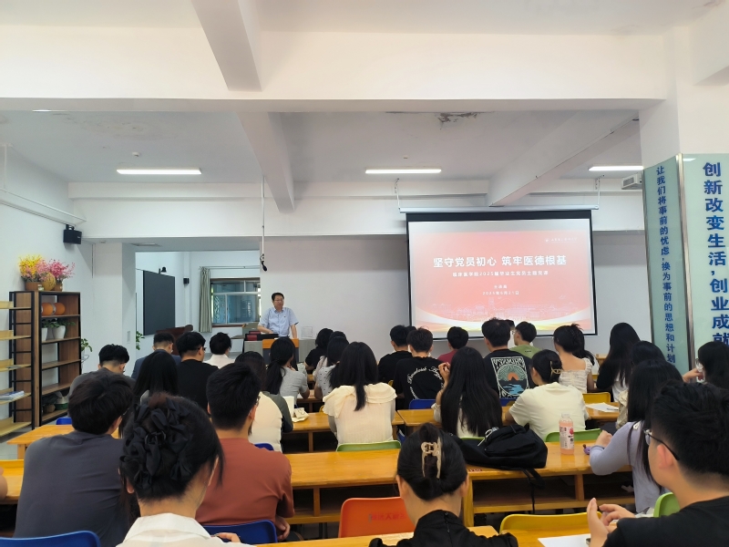 近日,av大平台 在浮烟山校区济世书院开展2025届毕业生党员主题学习教育活动。学校副校长、av大平台 (附属医院)党委书记王承高以《坚守党员初心,筑牢医德根基》为题讲授专题党课。学院党委副书记刘刚主持活动,毕业年级辅导员和全体毕业生党员参加。