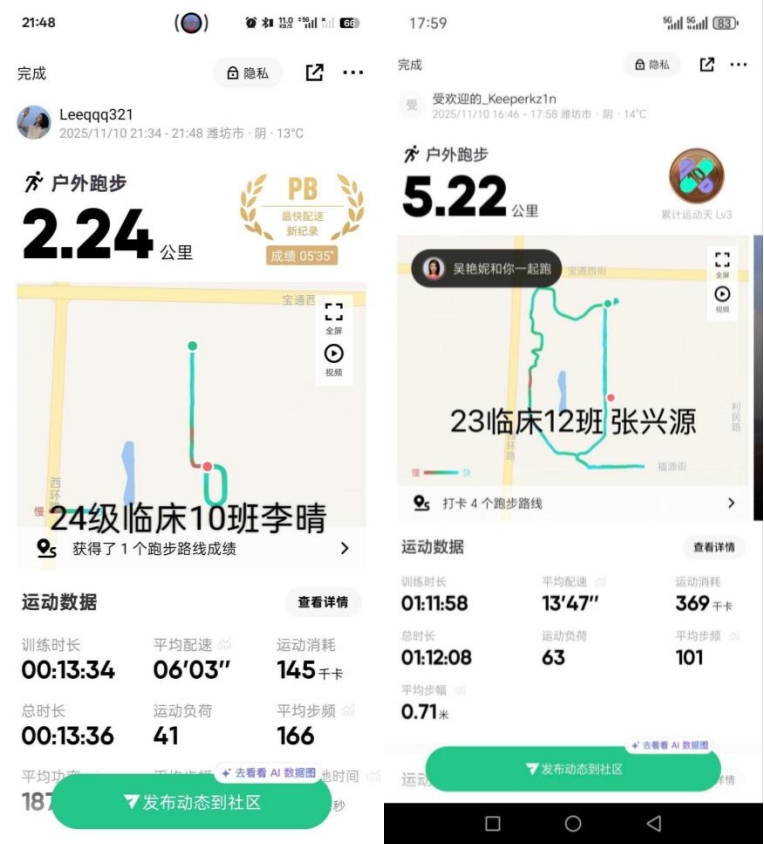 本次活动鼓励同学们使用运动软件记录跑步里程与轨迹,并上传至指定平台完成打卡。同学们在紧张的学习之余,积极利用清晨、傍晚等课余时间,在操场、校园绿道等场所坚持跑步锻炼。活动期间,累计收到有效跑步里程数千公里,充分展现临床学子积极参与体育锻炼的热情和持之以恒的奋斗精神,彰显新时代医学生朝气蓬勃、昂扬向上的精神风貌。