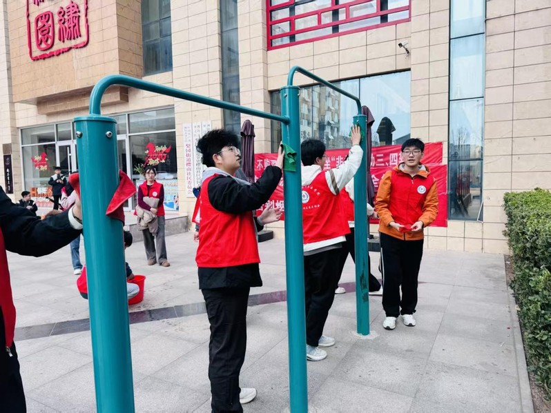 志愿者们在樱南社区服务中心大厅集结完毕,统一身着红色志愿马甲,精神饱满、整装待发,展现出新时代青年学子积极向上的良好精神风貌。在社区工作人员的带领下,志愿者们首先对公共健身区域的健身器材进行认真检查,仔细查看器材是否稳固、零部件是否完好、使用过程中是否存在安全隐患,保障社区居民拥有安全放心的健身环境。随后,志愿者们分工协作,拿起抹布、水桶等工具,对社区健身器材及周边公共设施进行全面清洁。