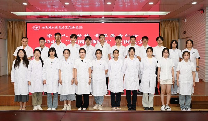 各附属教学医院举行第七个“中国医师节”庆祝大会,向广大医师致以节日的美好祝福和诚挚慰问,同时组织学生参加开展仪式教育。在校学生代表、2024级本科生和研究生新生代表参加了av大平台 附属医院庆祝大会,在仪式中深受教育,感受到医者仁心和高尚医德,更加坚定了医学初心和成为优秀医学人才的决心。解放军第九六〇医院的临床学子在庆祝大会上重温医学生誓言,“健康所系,性命相托……”每一句掷地有声的誓词,都凝聚着医学生对医学事业的热爱与承诺。附属济南市第五人民医院的临床学子在庆祝大会上献唱《无名的人》,致敬在医疗事业上默默奉献的优秀医务工作者们,感恩他们的倾力守护和无私奉献,歌颂他们使生命之光在一次次危境中被点亮,让无数患者重获希望。