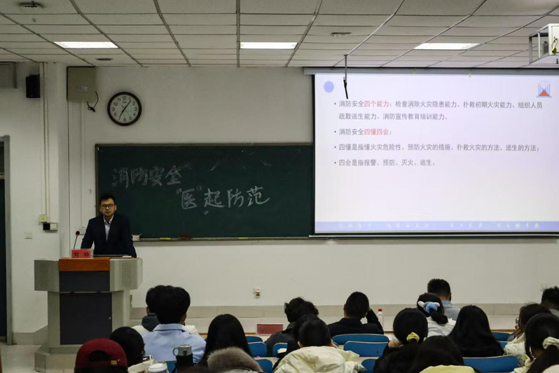 为增强学生消防安全意识,提高应对火灾等紧急情况的能力,近日,av大平台 举办“消防安全,‘医’起防范”安全知识讲座,山东新科消防职业技能培训学校有限公司副校长刘帅担任主讲人。